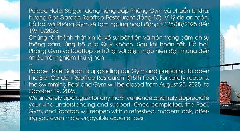 Palace Hotel Saigon es un establecimiento de 4 estrellas convenientemente situado en Ciudad de Ho Chi Minh. El servicio de habitación se puede arreglar para los huéspedes alojados en el hotel. La recepción está a su disposición las 24 horas del día para atender cualquier inquietud.